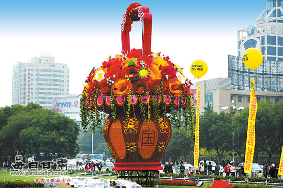 兰州东方红广场上鲜艳的大花篮增添了浓浓的节日气氛。