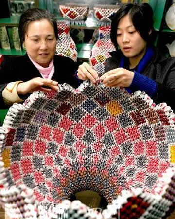 4月9日,两名四川省华蓥市市民用废旧纸张制作花瓶。当地居民利用废旧扑克牌、香烟盒等折叠制作花瓶、花篮、烟灰缸等工艺品,变废为宝,既保护环境又美化生活。新华社发 邱海鹰 摄