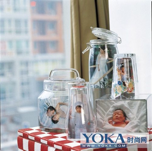 有人非常喜欢在家里摆上各式各样的照片,购买相框就是一大笔开支。食品的玻璃瓶包装、用旧的玻璃杯,不要扔掉,把它们的商标去掉,把照片塞进去,就是极好的照片展示工具。瓶子大小不一、形状各异,摆放在一起,更容易塑造整体效果。