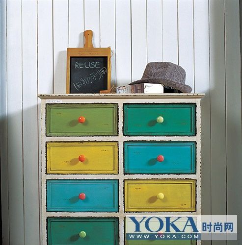 老式的抽屉柜,是上世纪80年代每个家庭的必备。几次搬家都舍不得扔是因为它的确非常好用。无论是在厨房还是在玄关,多个抽屉便于将零碎物品分类收起,找的时候很容易。水曲柳的表面都开裂了,没关系,用白色木器漆整个涂刷,抽屉部分可以按照室内的色彩涂上喜欢的颜色。可以多用几种色彩,用来区分抽屉内部物品的类别。