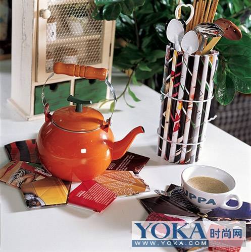 锅垫和盘子垫非常容易弄脏,不论什么材质脏了之后都难清洗。干脆使用废旧的报纸,像叠纸鹤那样,先叠成若干个菱形块,然后用订书钉或者双面胶拼接在一起,就做成了一次性的锅垫和盘子垫。用塑料饮料瓶制成的餐具笼也可以用报纸装饰一下,把报纸搓成小卷,然后依次贴在瓶子上,最后用漂亮的绳子装饰一下即可。