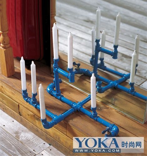 蜡烛并非永远是浪漫的代名词。刚刚装修过,家里剩下了不少水管和弯头,是拿去卖废品,还是自己动手做点什么东西?使用水管拼接而成的蜡烛台,创意味道十足,材料全部来自家中,非常节省费用。可以事先大概画个草图规划一下尺寸和布局,以免造成返工。安装完毕后用鲜亮的油漆涂刷一下,晾干即可。结实的水管蜡烛台,夏天摆在庭院里,非常合适。