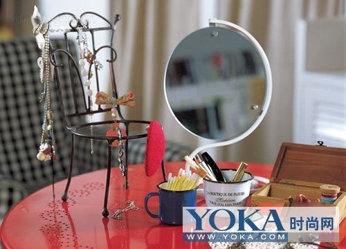 女孩子梳妆台上的物品非常细碎。化妆棉、眼线笔、不用专门购买收纳工具,用过的搪瓷小杯子、木头包装盒都能用。玩具铁艺椅子还能用来放项链等,梳妆台上再也不是一片狼藉。