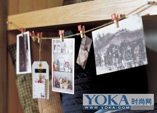 为了节省空间,家里储物的壁柜大多没有门,里面如果摆放了小件物品,会显得比较凌乱。可以用照片或者明信片做装饰,将它们用麻绳和小夹子固定,挂在壁橱的边框上,成为非常随意的装饰,能使人的视线停留,从而忽略柜子内部的凌乱。