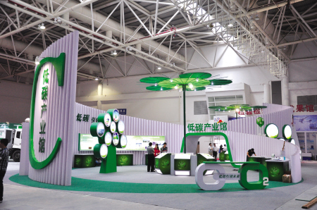 整个展馆的设计理念就是通透、明亮,通过绿、白两色,给人以环保清洁感觉,表达出人们对低碳生活的一种向往。省发改委相关人员告诉记者,由空心圆形硬纸片制作的墙壁圆柱体,由高到低形成两个英文大写字母C.其中展馆的大门设计成箭头,箭头从墙壁圆柱体的高处指向低处,寓意社会从高碳向低碳转变。绿色环保树则体现一种环保理念,正式展览时,环保树上将悬挂环保理念倡议。