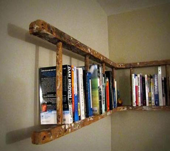“旧梯子书架” 旧木梯本身就是一件岁月气息浓郁的老物件,即使有一天无法承重无法架高,也可以橫置成为一个复古的装饰书架。