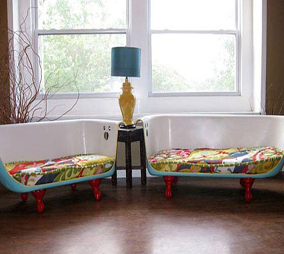 “旧浴缸沙发” 看到这个旧浴缸沙是否惊讶于达人们的奇妙创意?浴缸底部的蓝色与印花坐垫相得益彰,就算去家居店也淘不来这样的良品。