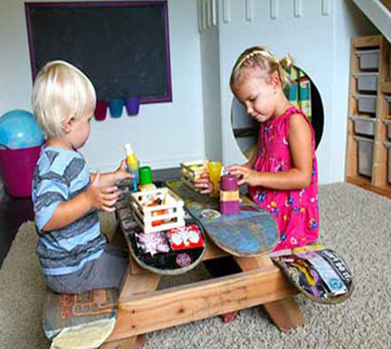 “旧滑板桌椅” 滑板玩旧了可以改装成桌椅,去掉轮子的滑板一样坚实耐用,而涂鸦的造型也让桌椅更具特色。