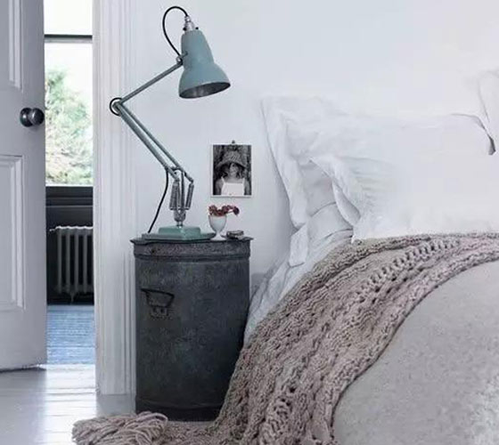 “旧铁桶床头柜” 废弃的铁皮垃圾桶可以通过一把螺丝刀变身为极具现代感的床头柜。