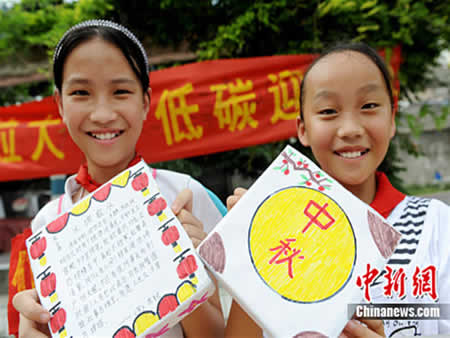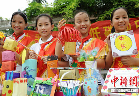 9月20日,安徽合肥一小学开展“小手拉大手低碳迎中秋”活动,孩子们展示了自己利用废旧物品制作的月饼盒、工艺品和节日小礼物,倡导低碳度中秋。(中新社发 韩苏原摄)